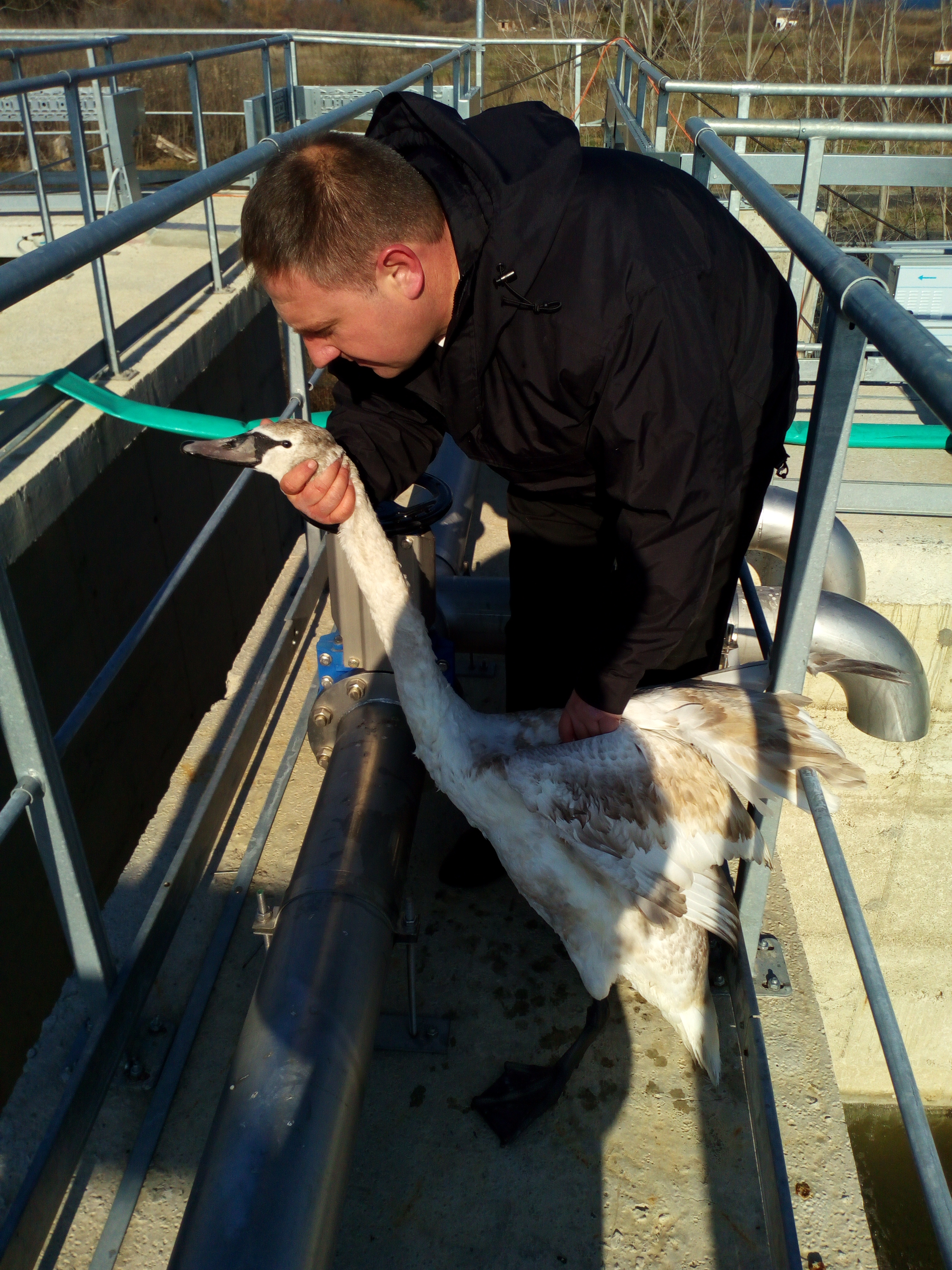 Със съдействието на Тодор Петков, доброволец към Българско дружество за защита на птиците /БДЗП/ и служители на пречиствателната станция, експертите от екоинспекцията са извадили птицата невредима.